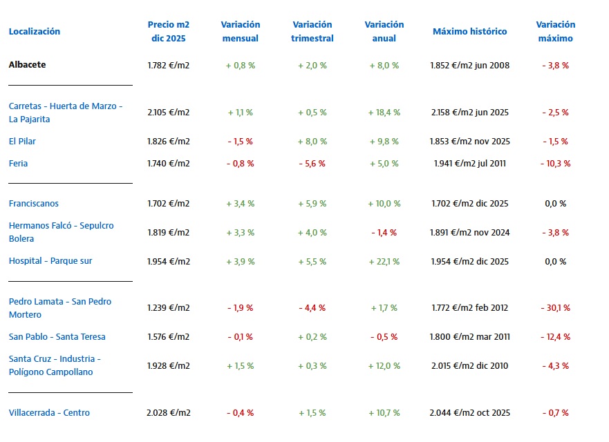 En Albacete, el mayor incremento anual se dio en Hospital-Parque Sur, con un 22,1% más. Le sigue Carretas-Huertas de Marzo-La Pajarita, con un aumento del 18,4%.