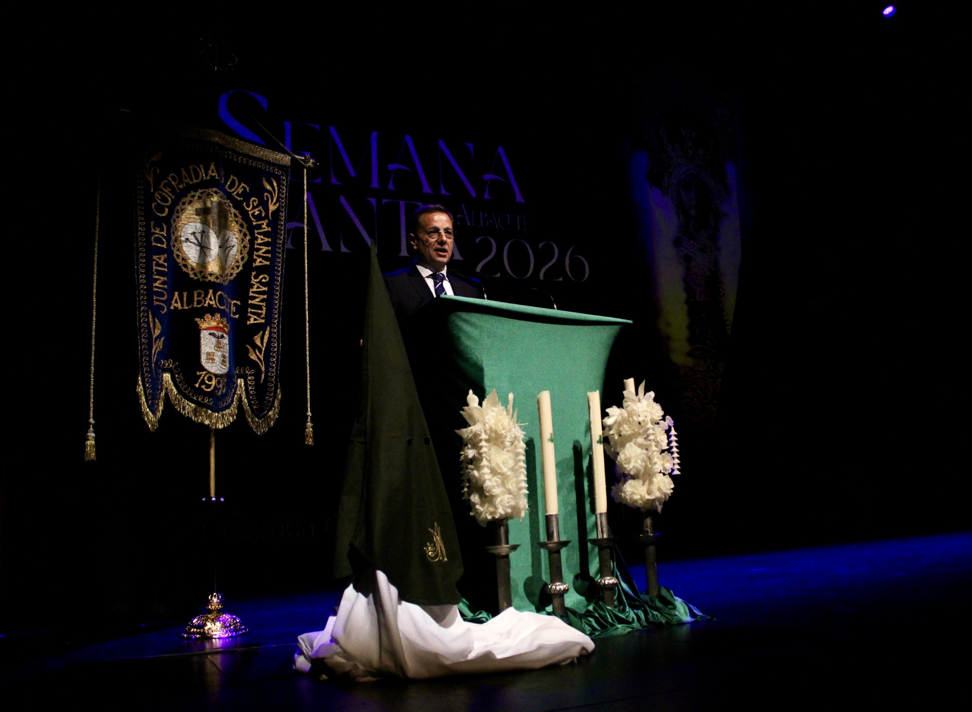 Serrano ha saludado al obispo de la Diócesis, Ángel Román y al presidente de la Junta de Cofradías Antonio Martín, que “junto al pregonero son los protagonistas destacados de esta Semana Santa de 2026, una Semana Santa que Albacete se dispone a vivir desde la fe y la participación ciudadana. Bienvenidos al Teatro Circo, este edificio monumental, que es el templo de la cultura y también es el corazón de la vida social en Albacete. Es el mejor lugar para pregonar la buena nueva de que llega la Semana Santa, engalanado con los colores verde y blanco de la Esperanza Macarena como protagonista del cartel”.