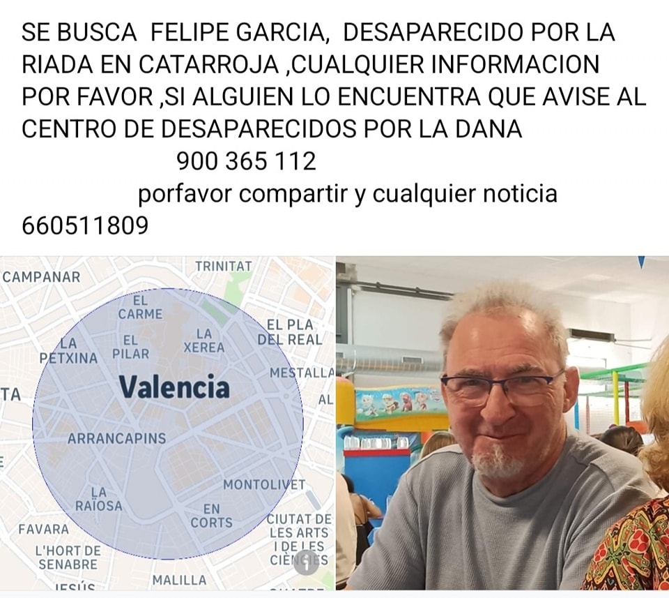 Esta mañana, el Ayuntamiento de Alcalá del Júcar lanzaba en sus redes la voz de alarma sobre la no localización de un vecino al que su familia busca en Catarroja. Felipe es muy conocido en la localidad, donde durante años regentó con su familia un bar de temporada en verano y la localidad está preocupada.