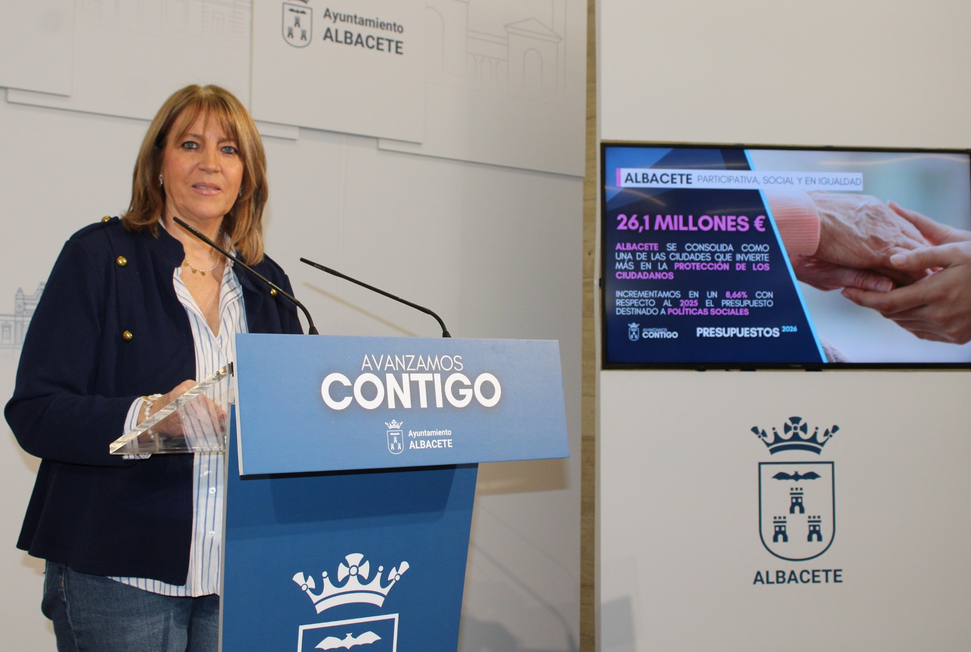 Llanos Navarro ha explicado que 14 de cada 100 euros de los presupuestos municipales, se destinarán este año a políticas sociales, 141 euros por habitante, lo que supone 10 euros más que en 2024, consolidando a Albacete como “una de las ciudades españolas que más gasto social por habitante destina”.