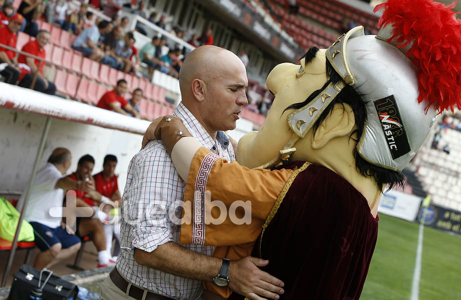 Luis César vuelve a la que fue también su casa, al estadio donde estuvo más de 100 partidos y donde dejó al Nástic en Primera, aunque quiere pelear hasta el final para traerse los tres puntos a Albacete, por muy cordial que le veamos en esta imagen de archivo saludando a la mascota del Nástic, Násticus.