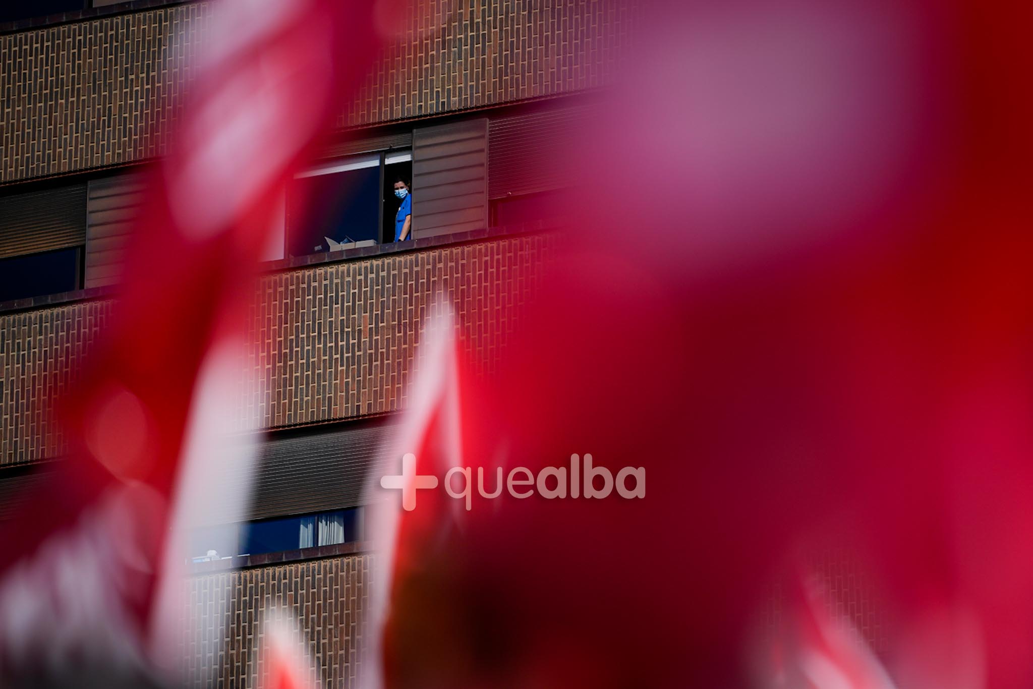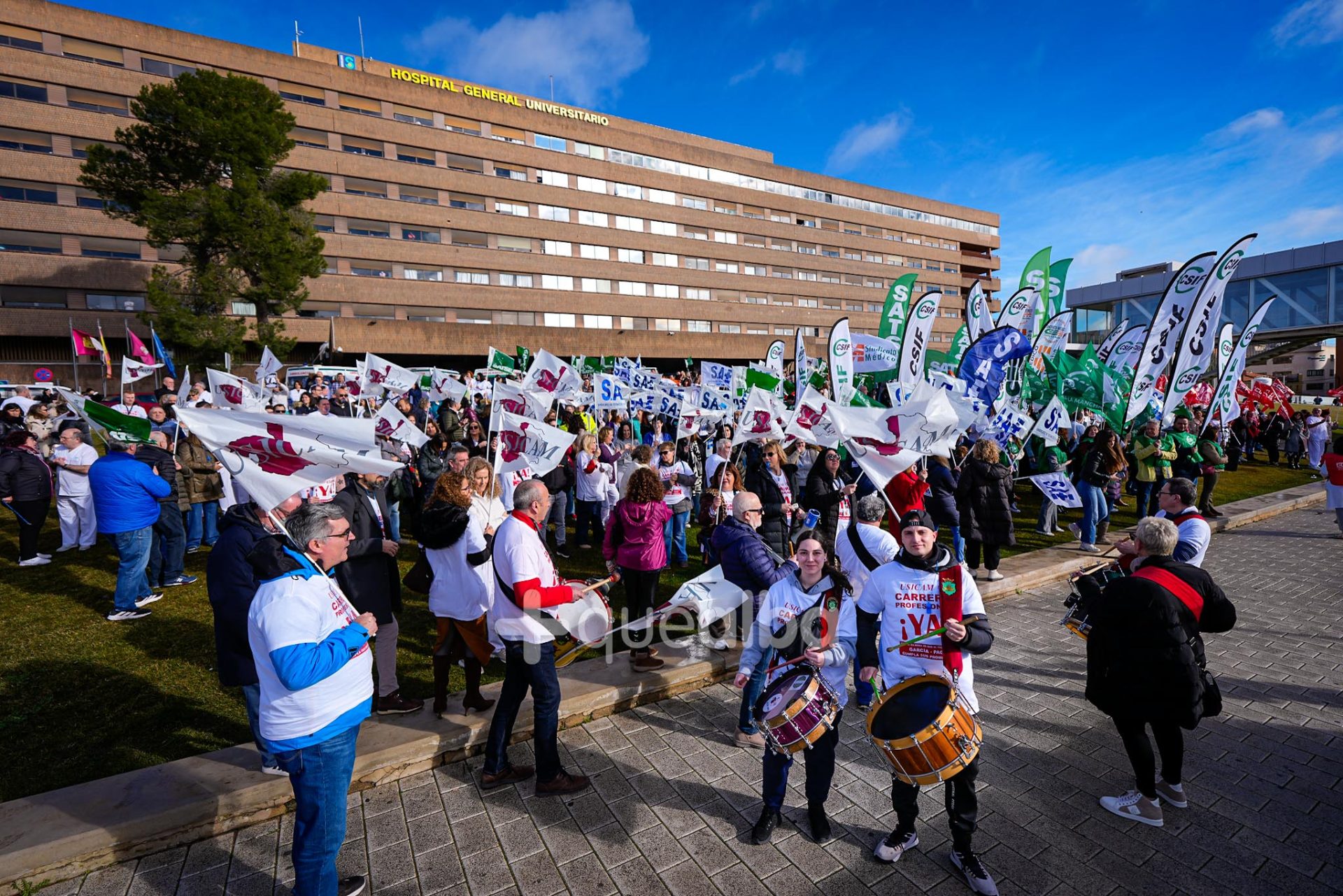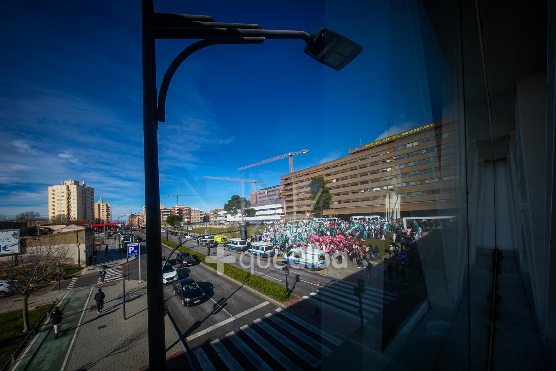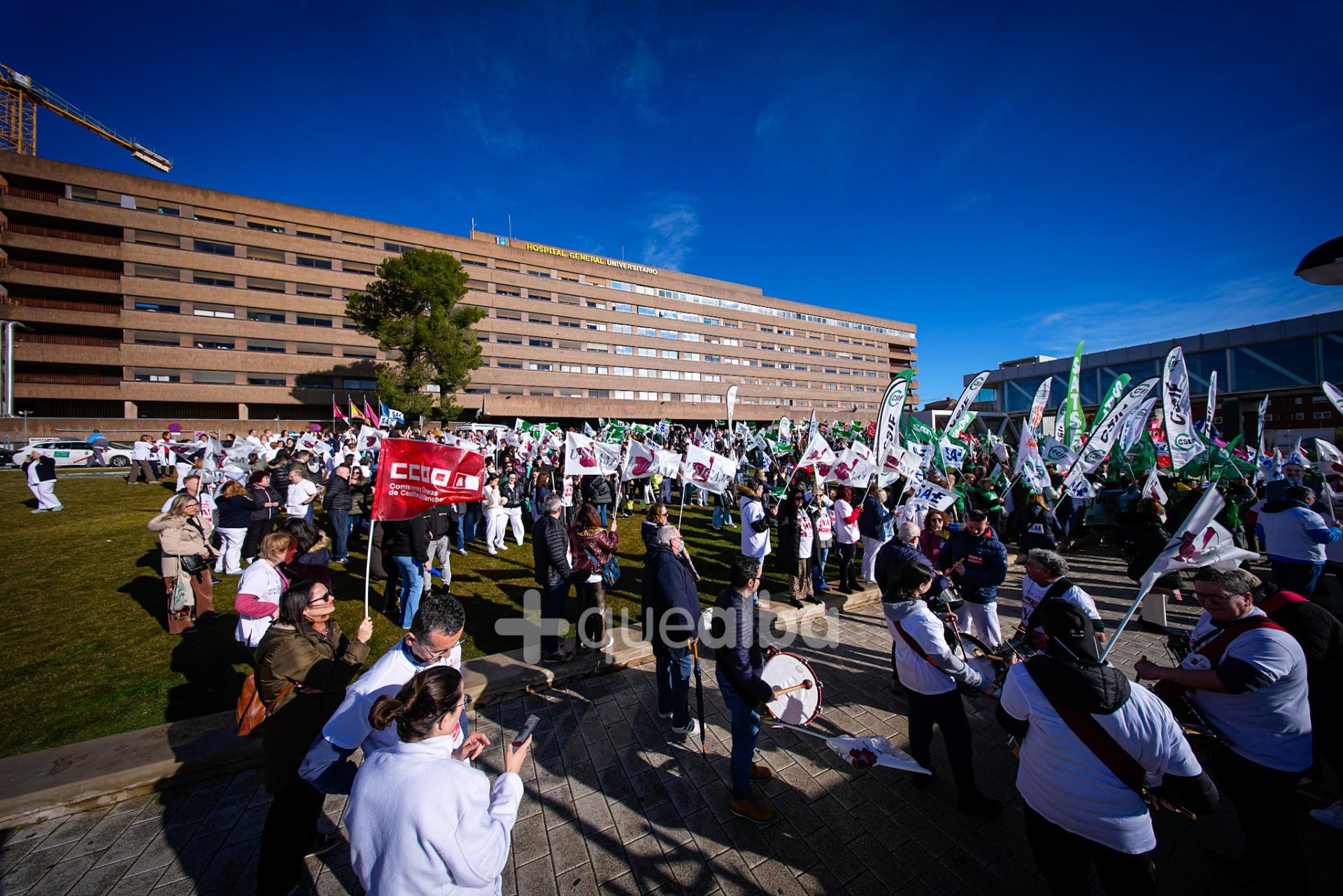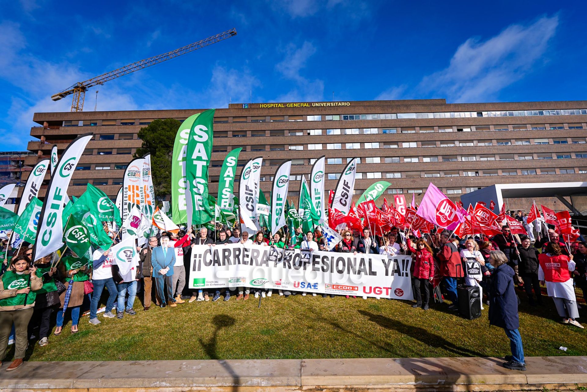 Unión sindical hoy en frente a la puerta principal del Hospital General Universitario de Albacete para exigir al Gobierno de Emiliano García-Page que recupere la carrera profesional en el Sescam. Siete sindicatos, SATSE, CESM, CSIF, USICAM, USAE, CC OO y UGT, se han unido de nuevo para exigir a la Junta la recuperación de la carrera profesional para todas las categorías del Sescam.