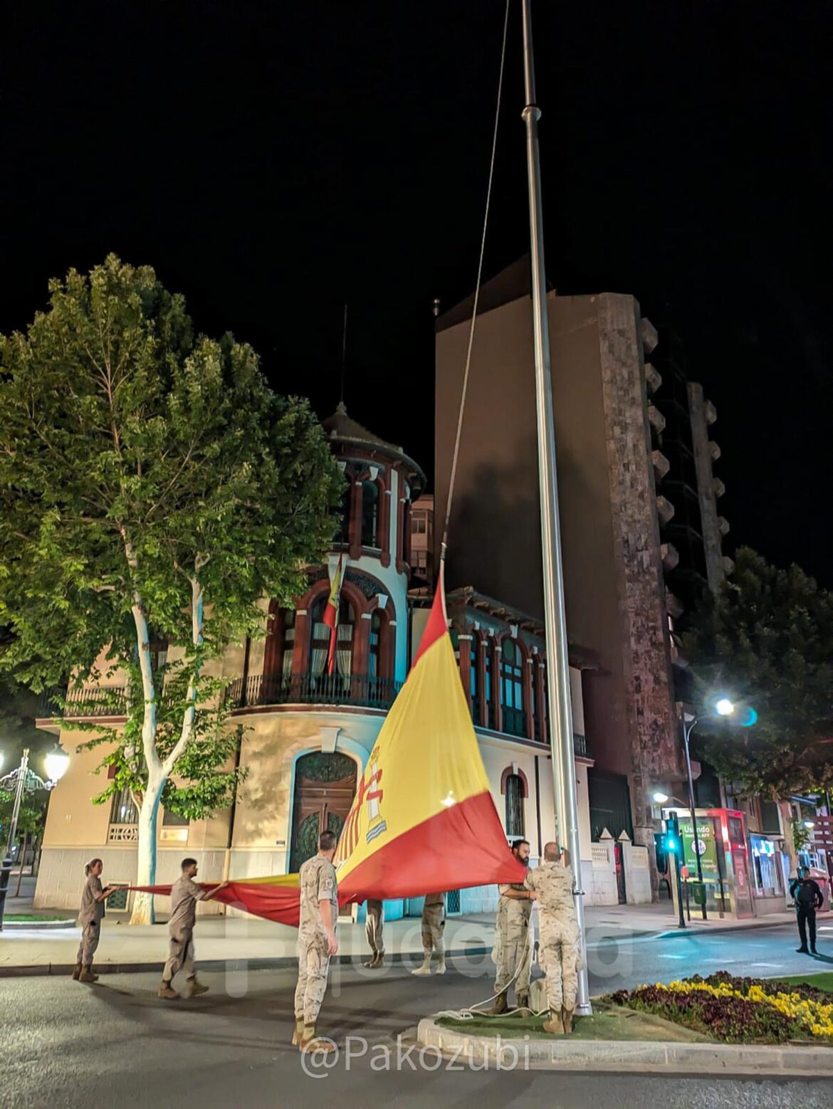 Y en esta medianoche llamaba la atención ver a varios militares poniendo y arriando la bandera de España de la punta del Parque. Están ensayando para que todo quede perfecto en el arriado de este viernes, 17 de mayo. Paco López nos manda la curiosa imagen de esta noche, con los militares ensayando con la bandera.