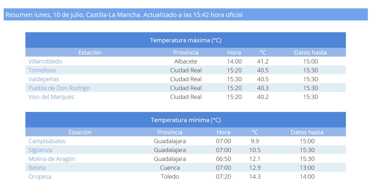 Y este lunes, Villarrobledo ya ha marcado 41,2 grados, siendo el municipio de toda Castilla-La Mancha con la temperatura máxima más alta este lunes, 10 de julio.