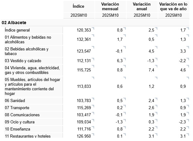 Sigue la escalada de precios en Albacete y, en general, los precios se han incrementado un 2,5% respecto al año pasado; un 1,7% en lo que va de año -con los datos hasta octubre- y un 0,8% en el último mes. Así lo refleja el Índice de Precios al Consumo (IPC) que ha publicado el Instituto Nacional de Estadística.