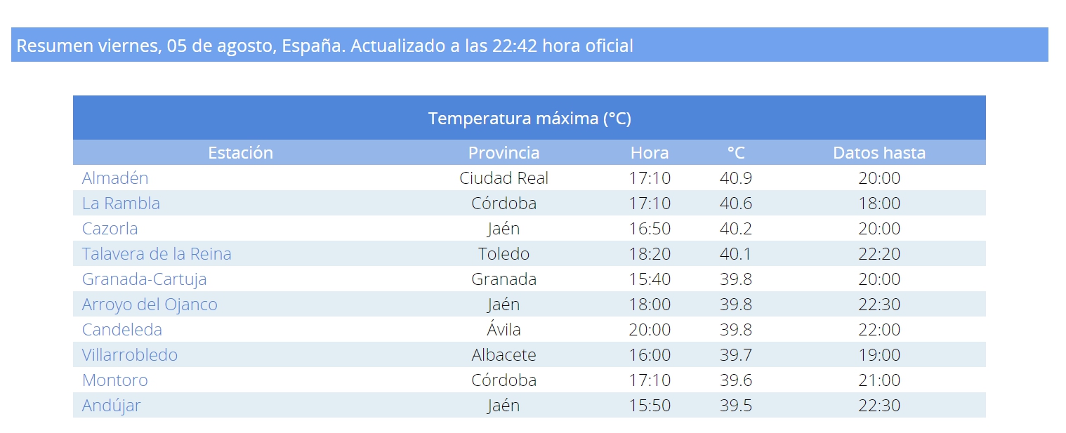 Pero sí han vuelto a estar, en este viernes, entre las 10 localidades de España donde se ha registrado una de las mayores máximas, según la información que recoge la Agencia Estatal de Meteorología.