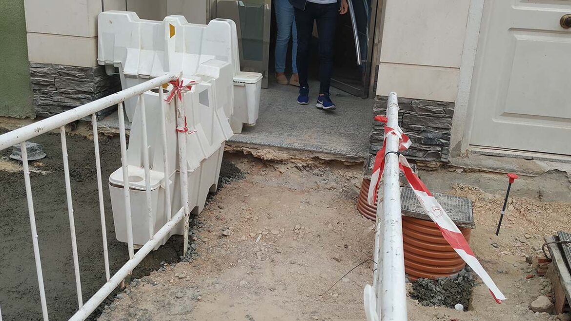 Las quejas saltaron este jueves porque en una de las viviendas de la zona el acceso quedó a mediodía totalmente impracticable y así se mantuvo toda la noche. El caso es que un trabajador de una oficina sita en dicho edificio y con esclerosis múltiple, por lo que va en silla de ruedas, tuvo que ser ayudado por los vecinos durante el mediodía para salir de la finca, ante el desnivel de unos 30 centímetros que habían dejado los operarios de la zona en el portal, que se puede ver en las fotos facilitadas a este medio.