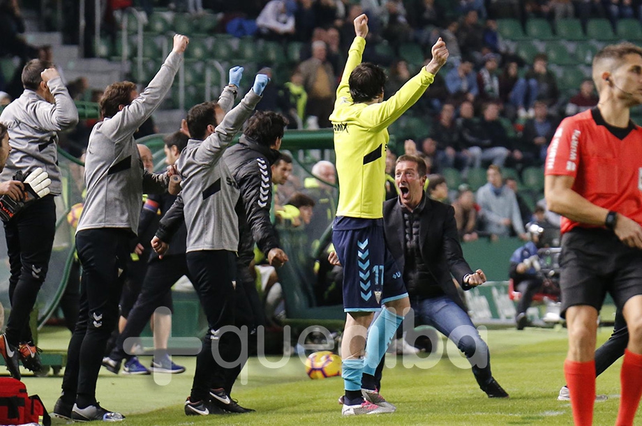Luis Miguel Ramis, míster del Elche, ha enloquecido con la victoria del Alba en el Martínez Valero y ha celebrado con abrazos y gritos de alegría los tres puntazos del equipo en Elche.