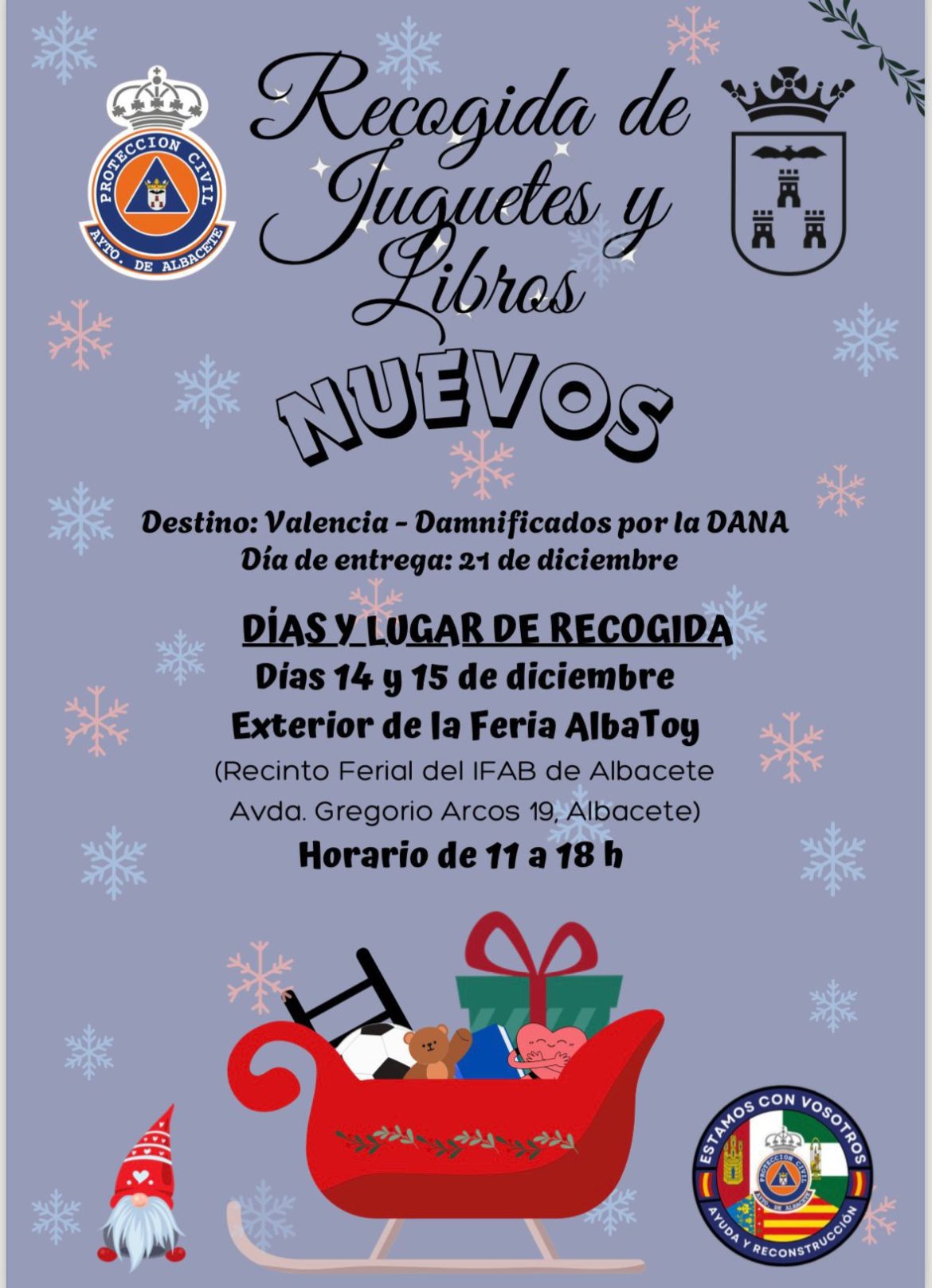 El Ayuntamiento de Albacete junto a la Agrupación de Voluntarios de Protección Civil va a iniciar mañana una recogida de juguetes y libros nuevos para ayudar a los damnificados por los efectos de las inundaciones de Valencia en la Feria de Coleccionismo, Juego y Ocio, `Albatoy´, situándose en el exterior del Recinto Ferial del IFAB.
