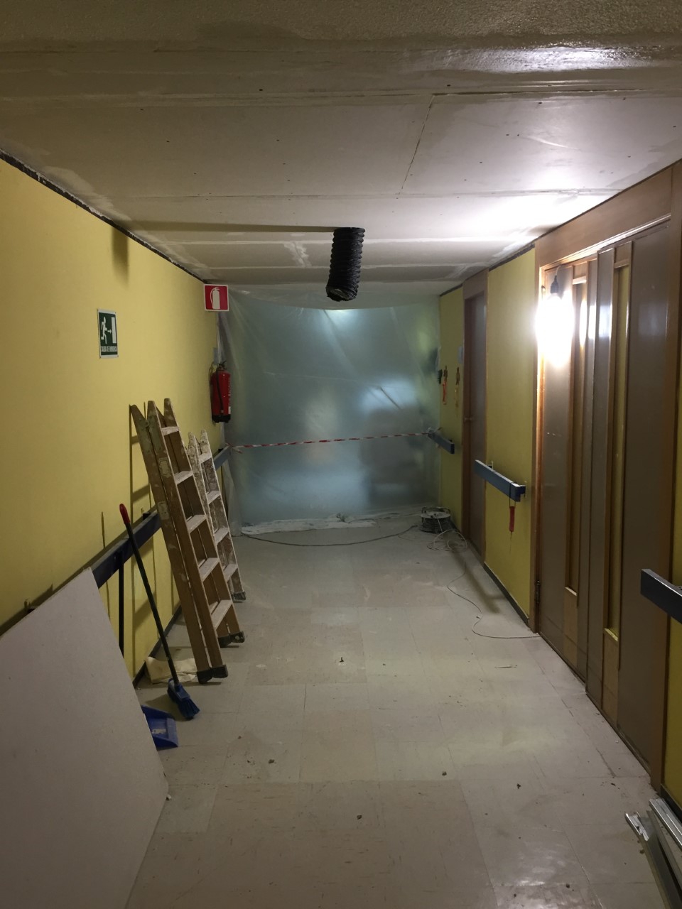 Desde primera hora de esta mañana, distintos operarios han trabajado en la zona y han llevado a cabo trabajos de albañilería y escayola que permitirán reabrir el área afectada a lo largo de esta tarde.