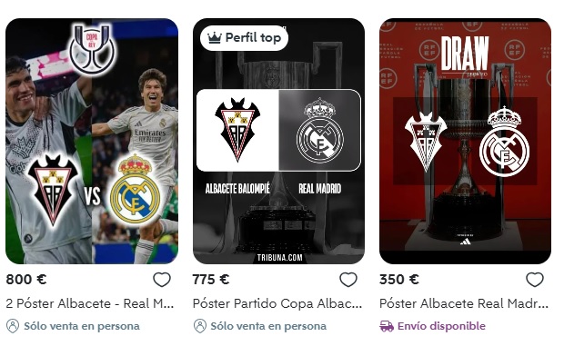 Y una tercera oferta indica que se vende «póster conmemorativo del sorteo de la Copa del Rey entre el Albacete y el Real Madrid. – Diseño con los escudos de ambos equipos. – Incluye el trofeo de la competición. – Fondo rojo con detalles del evento. -Prfrncia. 1 poster 500, 2 poster 700 edición limitada».
