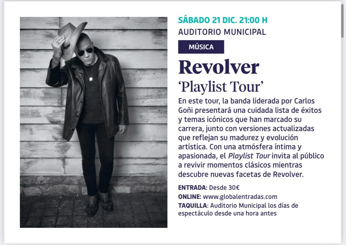 La jornada culminará a las 21:00 horas en el Auditorio Municipal con el esperado concierto de Revolver como parte de su ‘Playlist Tour’. La banda, liderada por Carlos Goñi, deleitará al público con una selección de éxitos icónicos y nuevas versiones que reflejan su evolución artística, ofreciendo una velada íntima y apasionada. Las entradas están disponibles desde 30€ en www.globalentradas.com o en la taquilla del auditorio desde una hora antes del espectáculo.