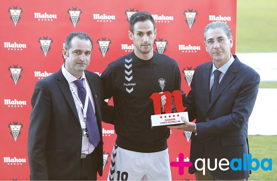 El delantero Rubén Cruz ha recibido esta tarde el trofeo 5 Estrellas que otorga Mahou y que ya ganó en otras ocasiones. Lo ha recibido antes del partido contra el Elche, de manos de Carlos Laorden, responsable de Anigma, distribuidor de Mahou en Albacete.