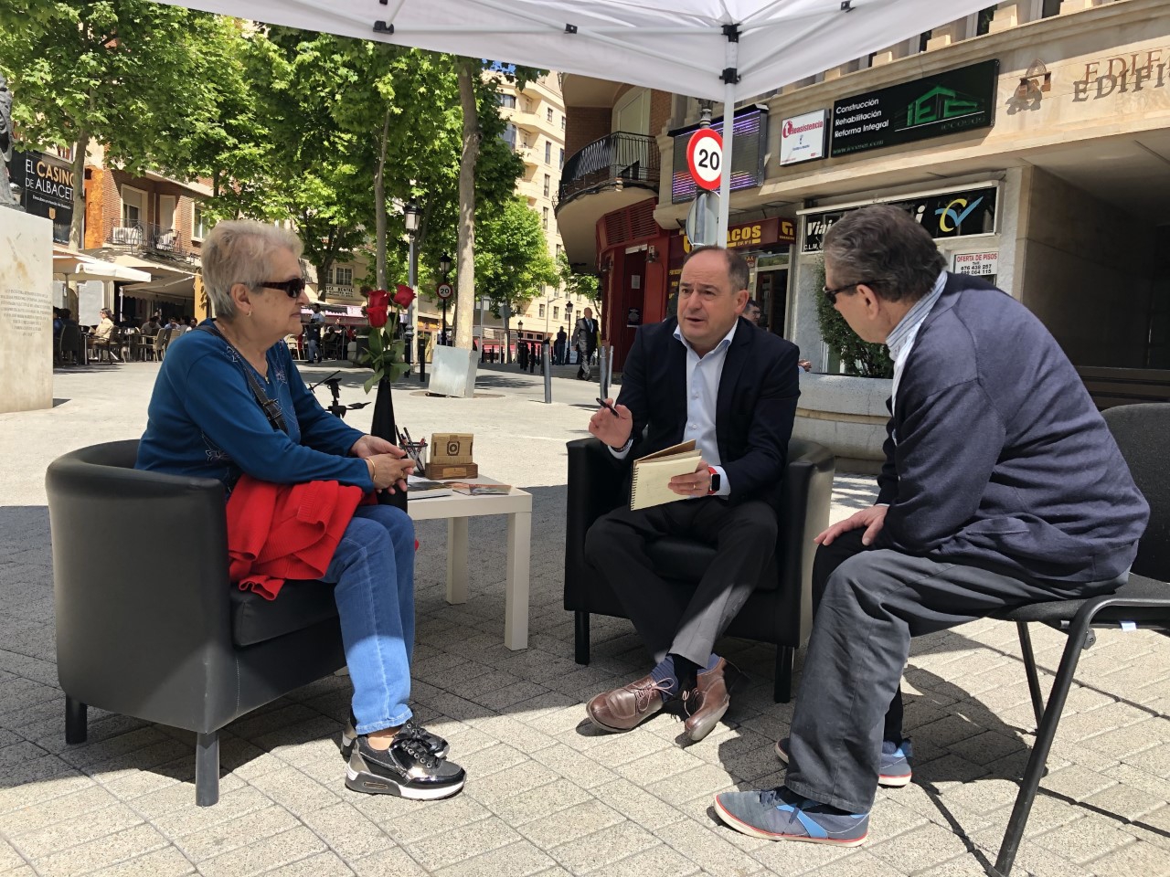 Sáez ha trasladado hoy, en la carpa instalada en la Plaza de la Constitución, su intención de sacar el despacho de la Alcaldía a la calle, resaltando que “la ciudad la tienen que hacer los hombres y las mujeres de Albacete”, y asumiendo su compromiso para atender a los vecinos y vecinas de la ciudad, una vez a la semana para escuchar sus demandas y reivindicaciones.