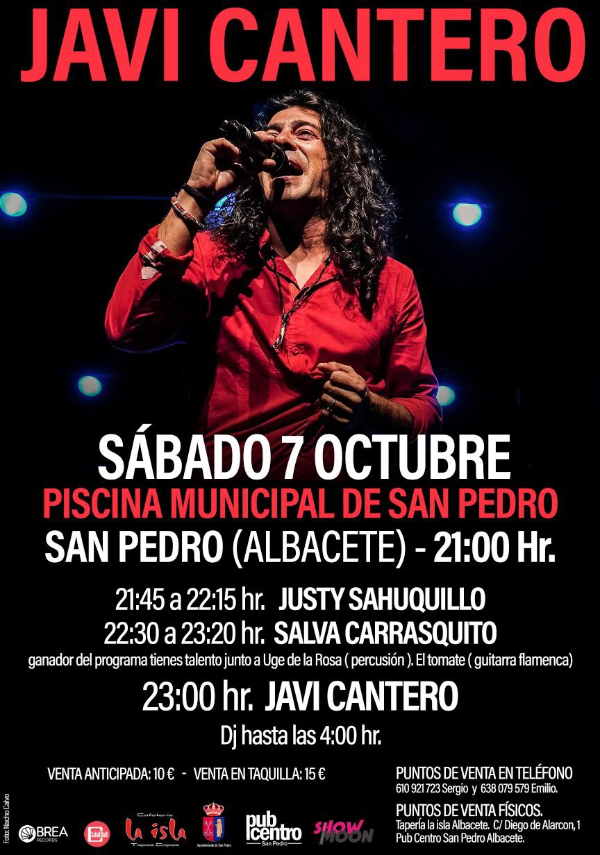La música de Javi Cantero llegará a partir de las 23:00 horas como el plato fuerte de este ‘Pilar Fest’. Más tarde continuará la fiesta con música de DJ que se prolongará hasta las 04:00 horas en la Piscina Municipal de San Pedro. El ritmo de venta de entradas es bueno, tanto en los puntos de venta físicos habilitados como en las reservas por teléfono. Hay diversos puntos de venta físicos, como el Ayuntamiento de San Pedro, el Pub Centro (San Pedro) o la Tapería La Isla (Calle Diego de Alarón, 1, en Albacete).