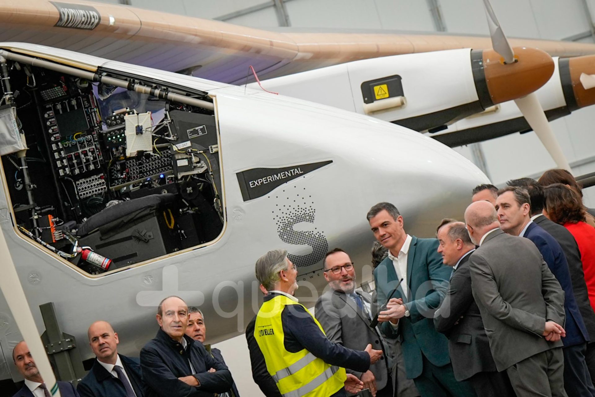 El presidente del Gobierno, Pedro Sánchez, ha visitado, este lunes en el aeropuerto de Albacete, las instalaciones de la empresa Skydweller, la compañía con sede en España y EEUU que desarrolla un avión solar no tripulado de vuelo perpetuo.