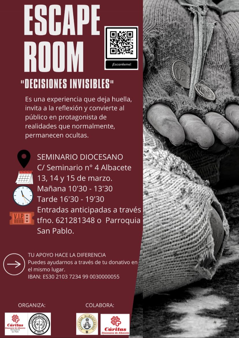 Desde Cáritas parroquial San Pablo preparan una nueva actividad solidaria, que tendrá lugar los días 13, 14 y 15 de marzo. En esta ocasión, un scape room que sensibilizará sobre las dramáticas situaciones a las que se enfrentan algunos de nuestros vecinos y que puede que no nos demos cuenta.