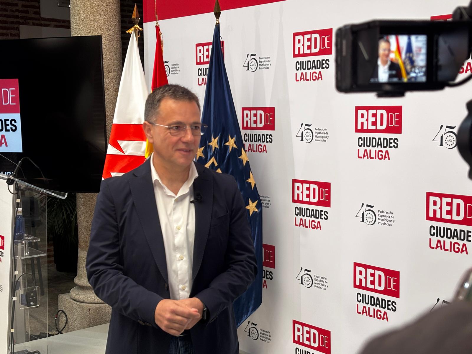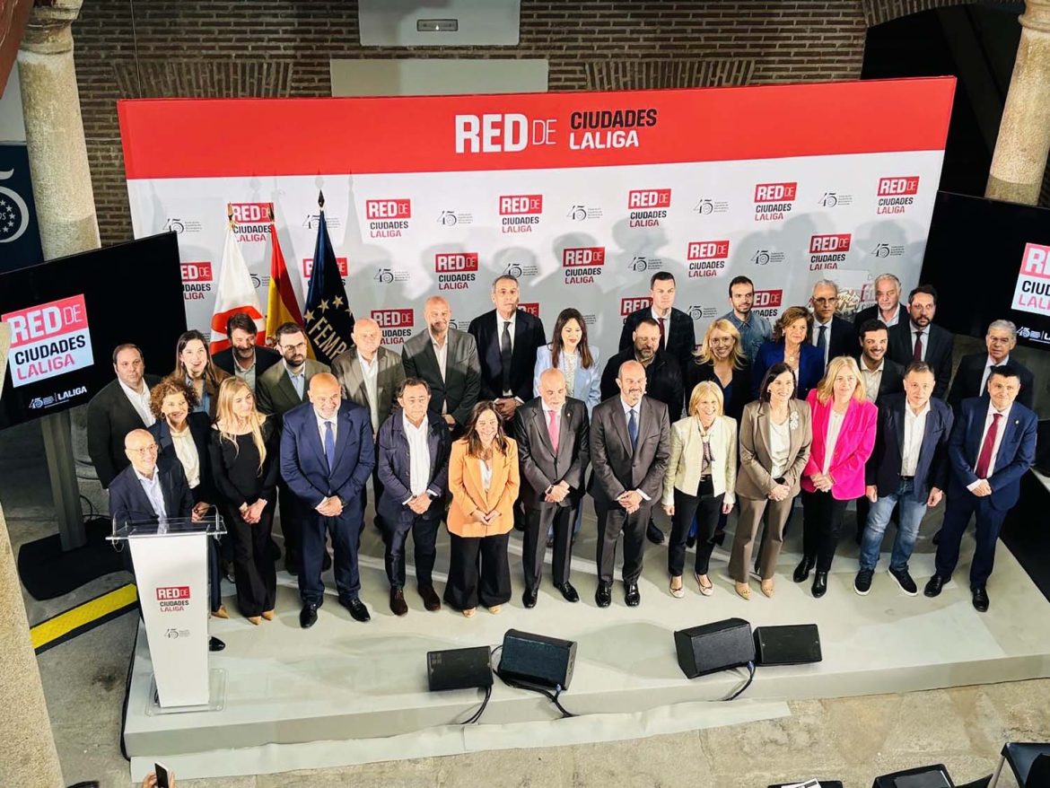 El alcalde Manuel Serrano y el concejal de Deportes, Francisco Villaescusa, han participado en Madrid en el acto de presentación de la Red de Ciudades LaLiga, impulsada por la FEMP para favorecer la convivencia, la inclusión y el respeto en el mundo del fútbol. En el acto han intervenido los presidentes de la LaLiga, Javier Tebas, y del Senado, Pedro Rollán.