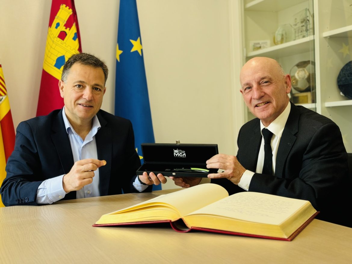 Vicente Rouco ha firmado en el libro de honor del Ayuntamiento, y además ha recibido como recuerdo una navaja conmemorativa del aniversario del Museo de la Cuchillería.
