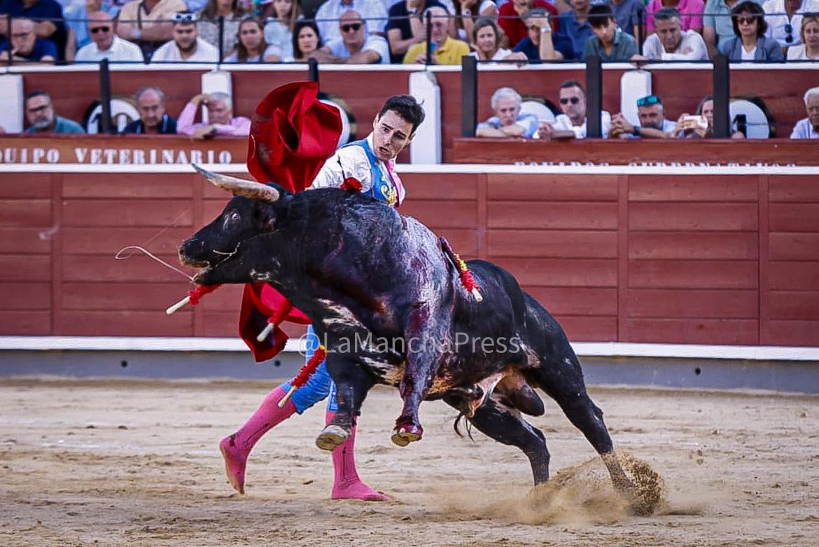 El utrero acusó la querencia y prendió al albaceteño a la altura del gemelo izquierdo. Ya en el suelo, el pitón se perdió por la chaquetilla. Pudo continuar la lidia. Se marchó a la enfermería, doliéndose del gemelo izquierdo. Tuvo que ser intervenido y no pudo volver a salir.