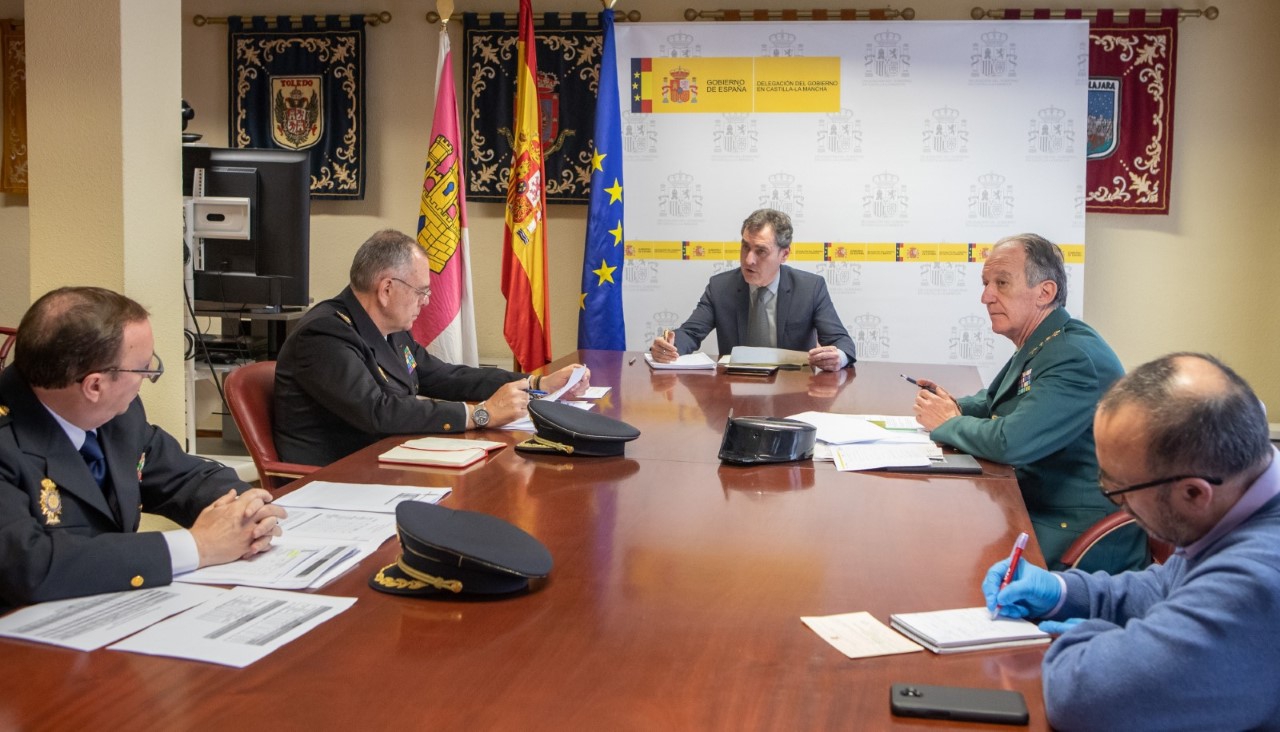 El delegado del Gobierno de España en Castilla-La Mancha, Francisco Tierraseca, ha mantenido una reunión de coordinación de las actuaciones frente al COVID-19 con el jefe superior de Policía de Castilla-La Mancha, Félix Antolín, y el jefe de zona de la Guardia Civil en Castilla-La Mancha, el general de División Francisco Esteban Pérez, en la Delegación del Gobierno.