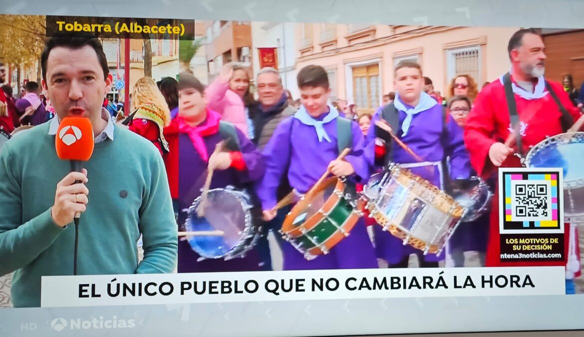 Una decisión que ha convertido a Tobarra en noticia nacional. Este Jueves Santo, en directo desde esta localidad han conectado en el informativo de Antena 3, para recordar sus 104 horas de tamborada, que comenzaron ayer.