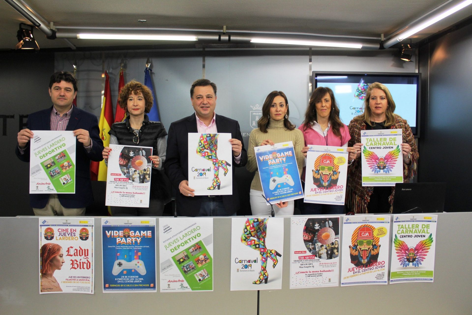 | El alcalde de Albacete, Manuel Serrano, ha presentado las actividades programadas por el Ayuntamiento con motivo de Jueves Lardero, que se celebra el próximo día 28 de este mes, así como la programación del Carnaval 2019, acompañado por los concejales responsables de Cultura, Mª Ángeles Martínez, el concejal de Deportes, Francisco Navarro, la concejal de Medio Ambiente, Rosa González de la Aleja, de Juventud, María Gil y la responsable de la Universidad Popular, Llanos Navarro. |