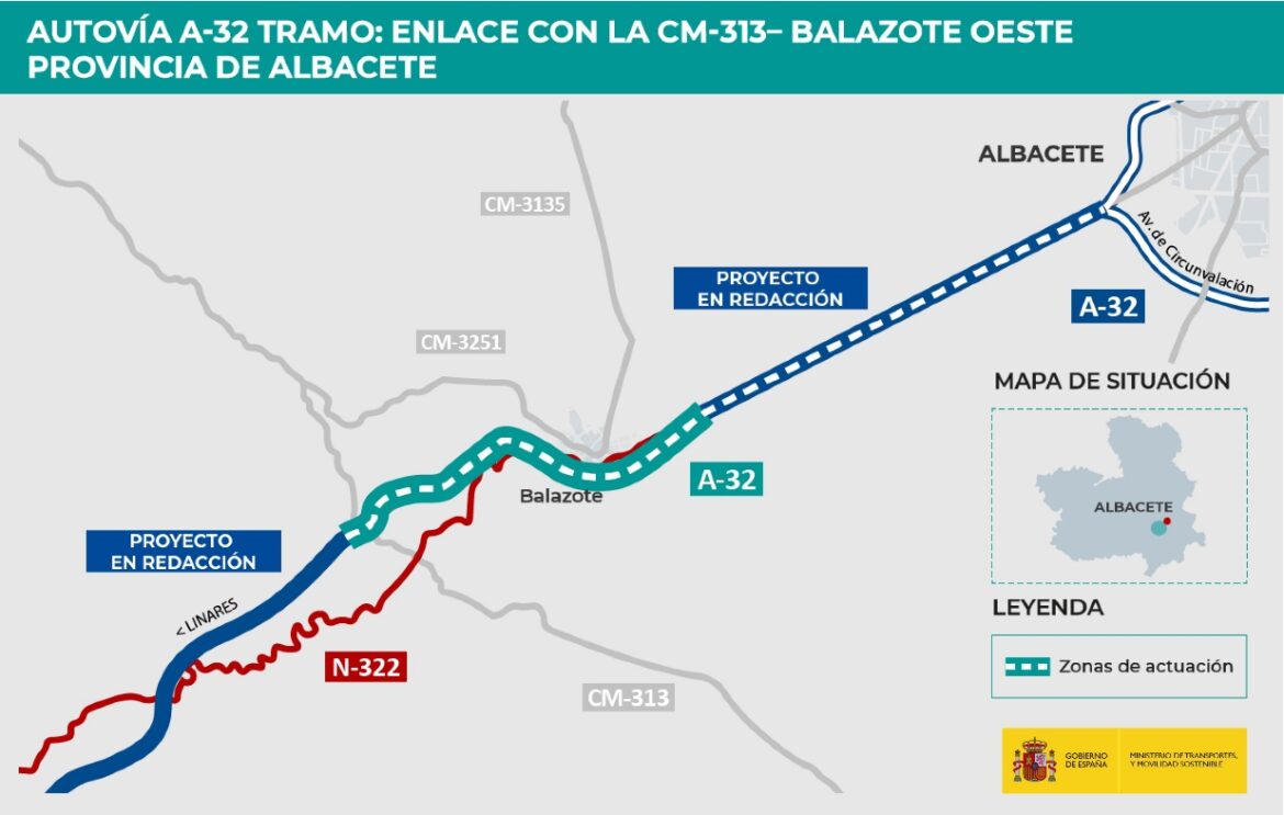 El Ministerio de Transportes y Movilidad Sostenible ha adjudicado con un presupuesto de 96,55 millones de euros (IVA incluido), el contrato de obras en la autovía A-32 Linares – Albacete para el tramo entre el Enlace con la CM-313 y Balazote Oeste, en la provincia de Albacete.