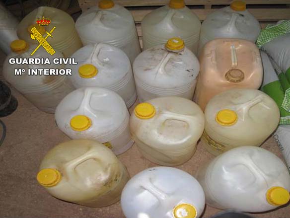 Durante la inspección ocular realizada en la zona donde estas personas fueron sorprendidas, se consiguieron localizar 15 garrafas de plástico de 25 litros de capacidad, algunas de ellas cargadas de gasoil.  Este combustible procedía de distinta maquinaria, utilizada en las distintas labores agrícolas de la finca.