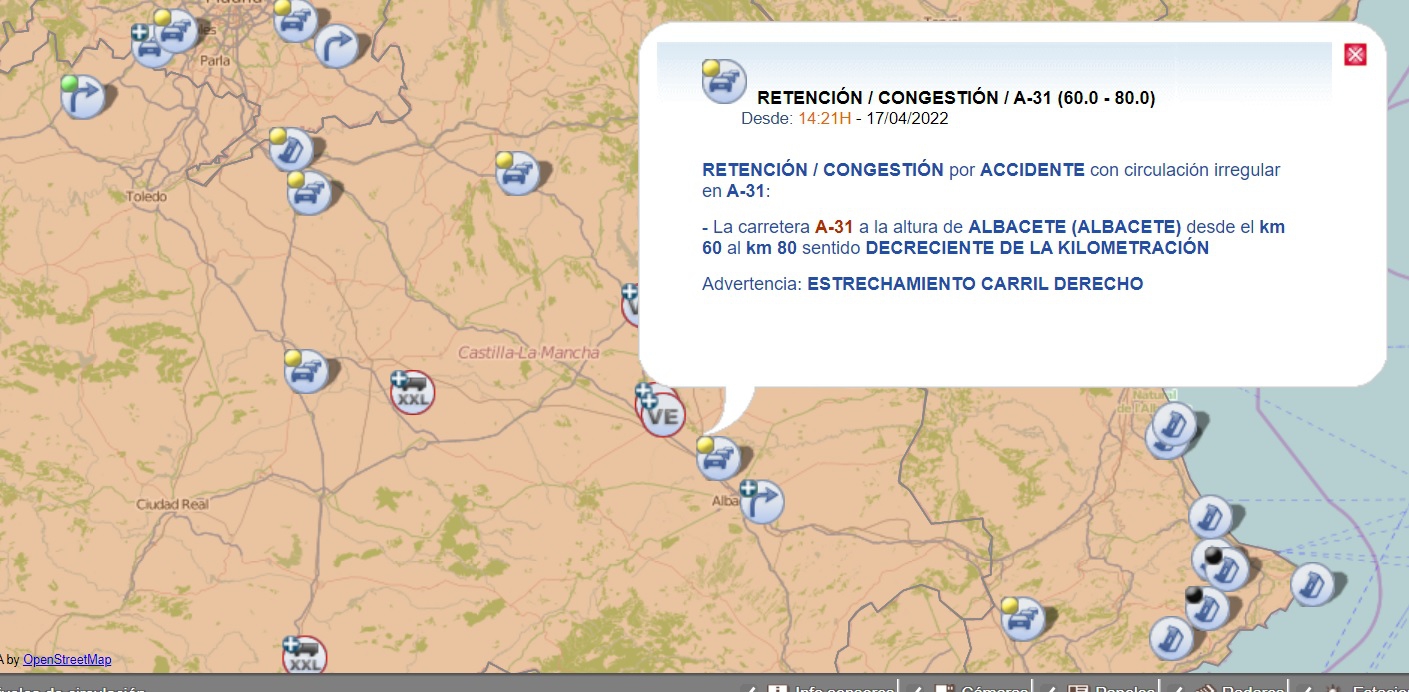 Mediodía complicado en las carreteras albaceteñas, en la Operación Retorno de Semana Santa. Un accidente, pasadas las dos de la tarde, a la altura de La Gineta, provoca retenciones, sentido Madrid, entre los kilómetros 60 y 80 de esta vía, como informa la Dirección General de Tráfico (DGT) en su página web.