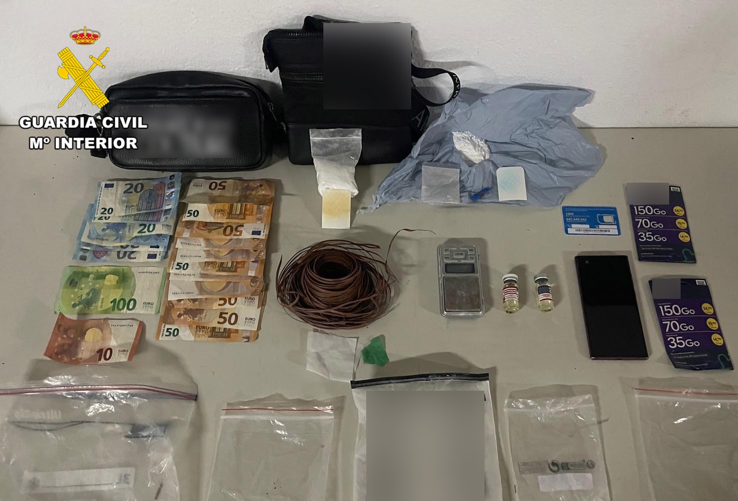 Además, se intervinieron 750 en efectivo, supuestamente procedentes de la venta de los estupefacientes, un teléfono móvil y varias tarjetas sim para telefonía.