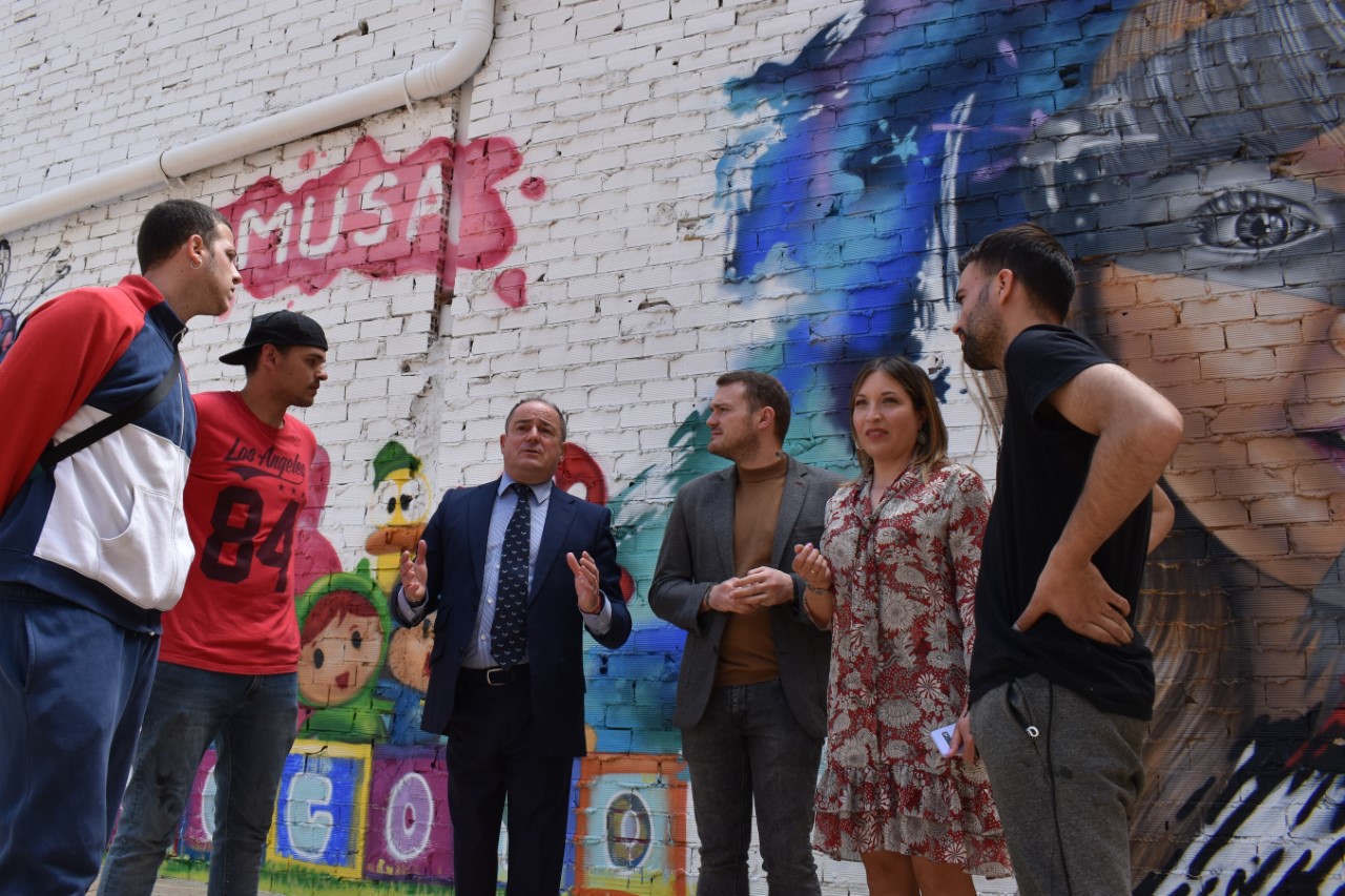 El alcalde de Albacete, Emilio Sáez, acompañado del concejal de Participación, Manu Martínez, y de la concejala de Formación y Empleo, Amparo Torres, ha visitado esta mañana la zona de juegos infantiles ubicada junto a la Casa Consistorial, que se puso en marcha dentro de la estrategia europea Edusi, y donde integrantes de la asociación Musa Urban Art, de Albacete, realizan un mural sobre las paredes, todo ello coordinado por Gonzalo Montero.