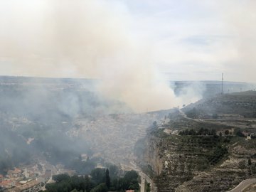 El incendio que a primera hora de esta tarde se declaraba en una chopera entre Alcalá del Júcar y La Recueja ha llenado de humo la hoz del Júcar en este tramo y los efectos son visibles en todo Alcalá del Júcar, como así lo muestra la imagen que nos manda @serdna40.