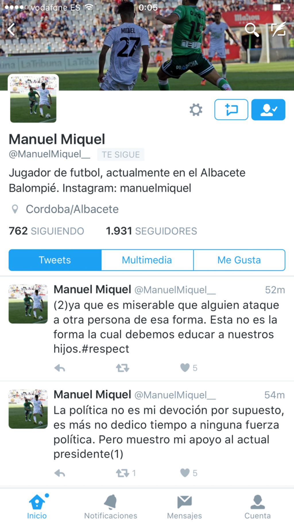 El canterano Miquel ha condenado en su cuenta de Twitter cualquier tipo de violencia, en relación con el puñetazo que ha sufrido el presidente del Gobierno, Mariano Rajoy. Aunque reconoce que no le interesa la política, el joven jugador del Alba condena la violencia.