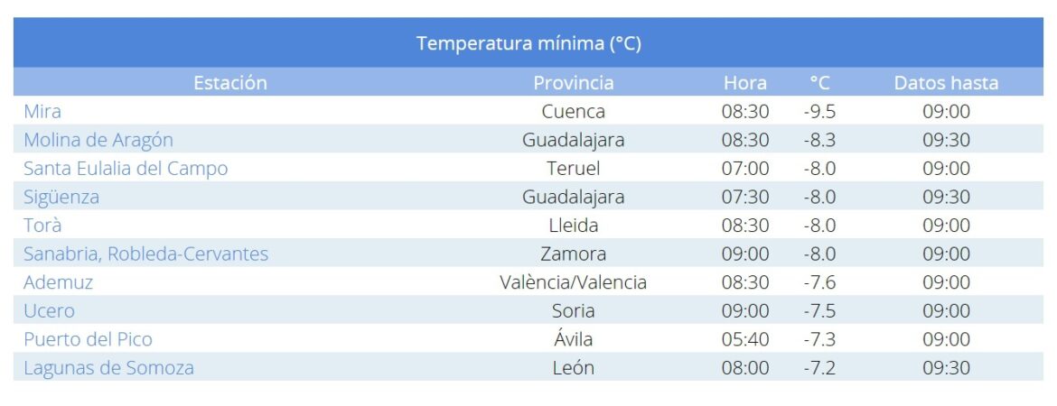 Castilla-La Mancha ha marcado en la madrugada de este 26 de diciembre las temperaturas más bajas de todo el país. Según recoge la web de la Agencia Estatal de Meteorología (AEMET), la localidad más fría ha sido Mira (Cuenca), con -9,5º bajo cero.
