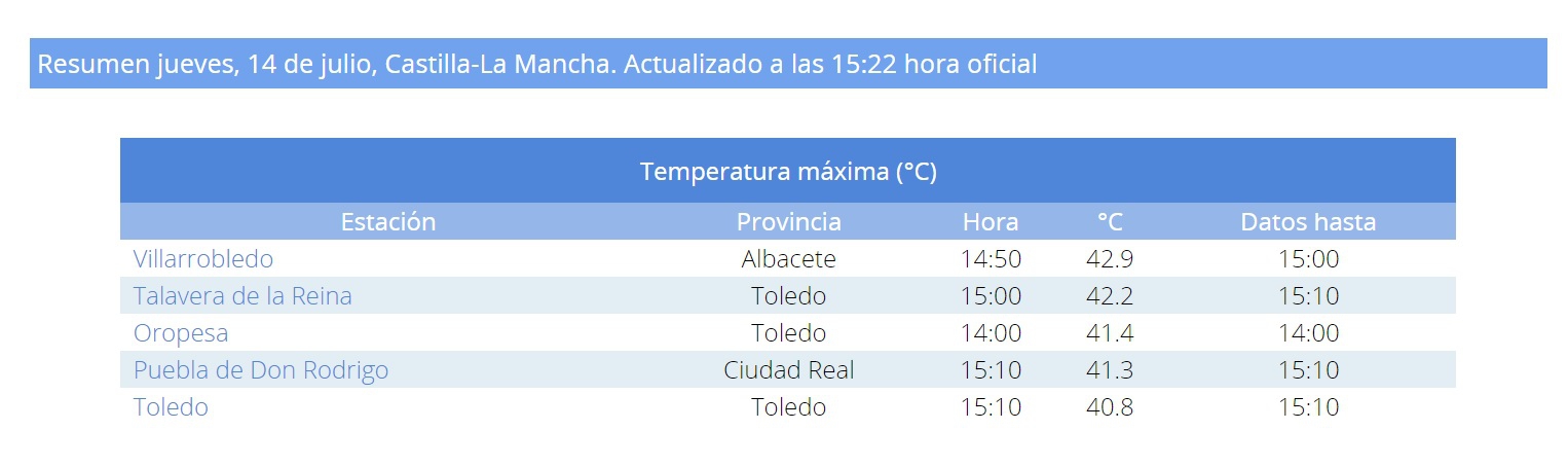 Ayer, Villarrobledo rozaba los 44 grados y era la tercera localidad con más calor de la región. Este jueves, 14 de julio, a las 15.22 horas, Villarrobledo es el municipio de toda Castilla-La Mancha con la temperatura máxima mayor, con casi 43 grados registrados, según los datos oficiales recogidos por la Agencia Estatal de Meteorología (Aemet).