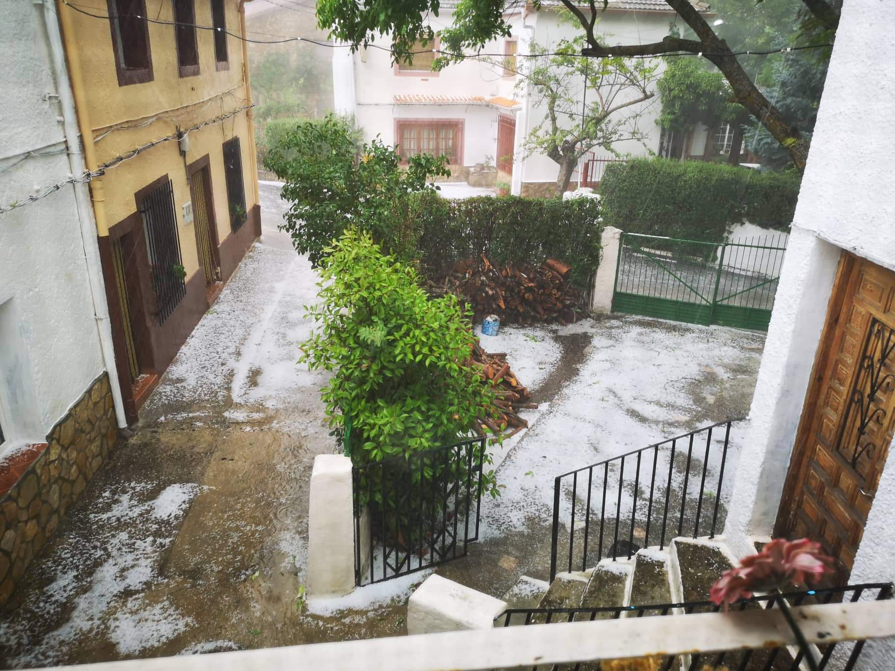 @MeteoHellín nos hace llegar imágenes de Ana Belén González que muestran la tromba de agua y granizo que ha caído esta tarde en Paterna del Madera, en la sierra albaceteña, y que ha cortado la carretera de Río Madera a Batán del Puerto.