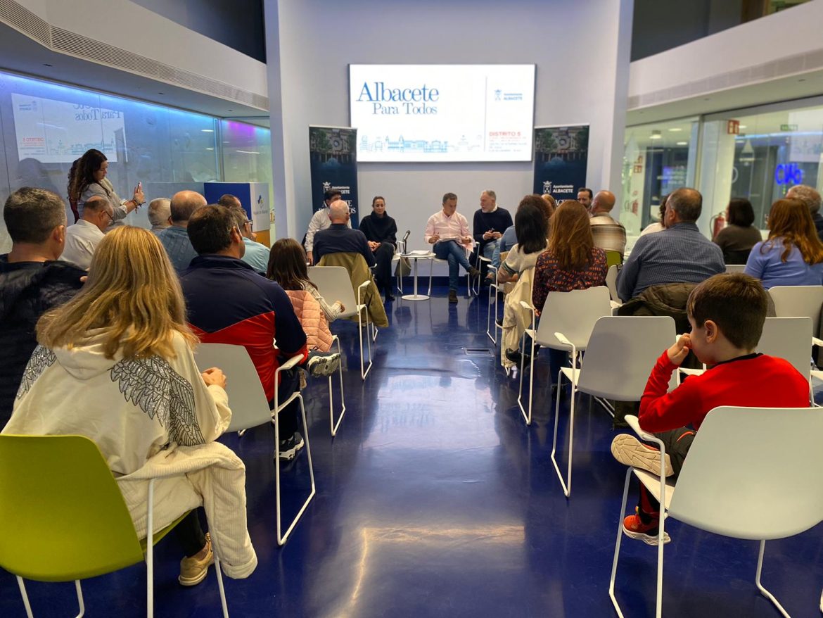 Manuel Serrano se ha pronunciado de este modo durante la sexta y última reunión programada en el marco de la segunda edición del programa ‘Albacete para todos’ que esta tarde ha tenido lugar en el Centro de Interpretación del Agua de la Fiesta del Árbol para los vecinos y vecinas del Distrito 5, correspondiente a los barrios de El Pilar, Cañicas-Imaginalia, San Pablo y Los Llanos del Águila, acompañado por los concejales de Medio Ambiente, Rosa González de la Aleja, de Barrios, Llanos Navarro, de Movilidad Urbana, Francisco Navarro, y representantes de la Fava.