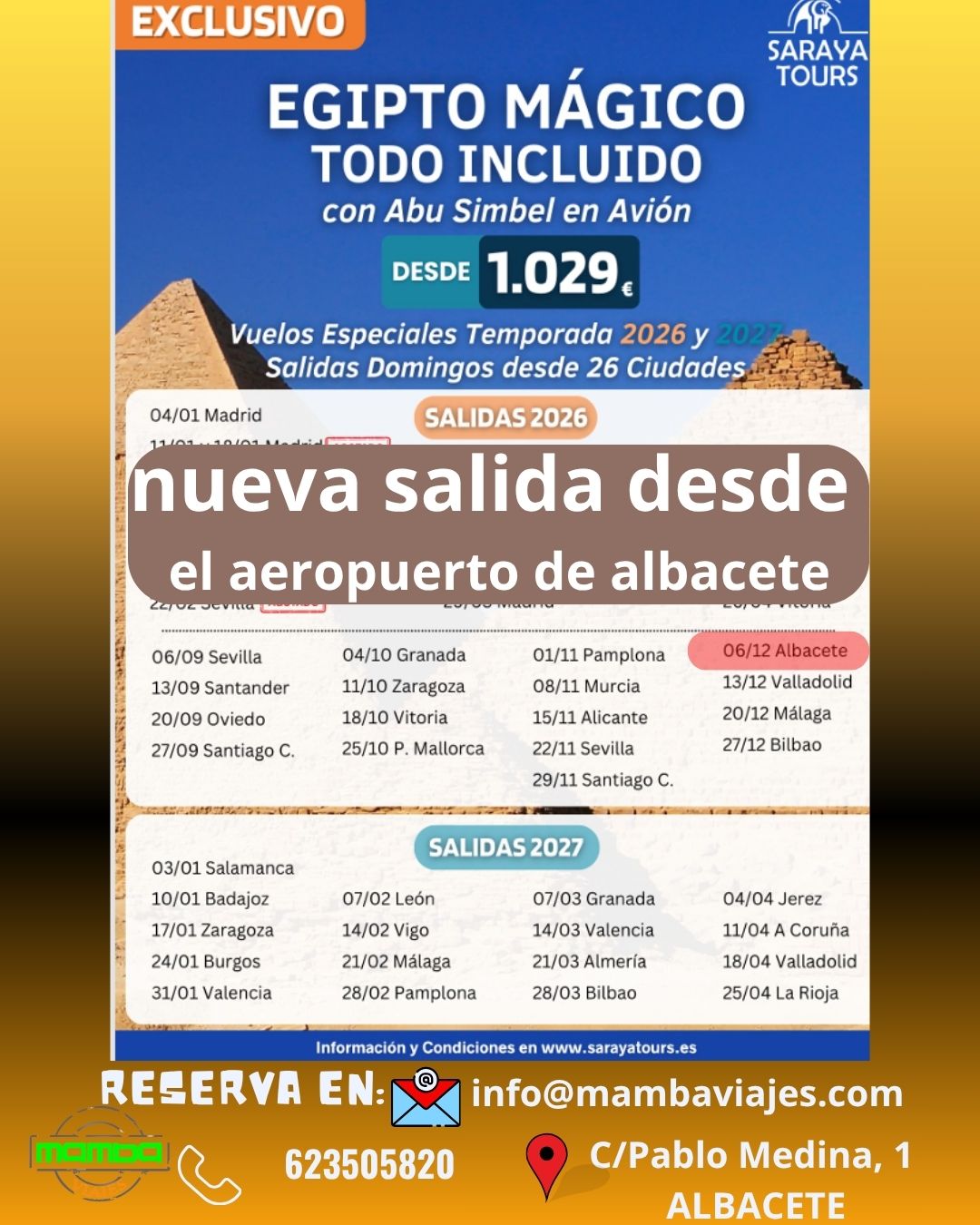 Volar desde Albacete a destinos con encanto será posible también en 2026. A la oferta que ya se conocía, se repite un nuevo viaje a Egipto, esta vez con salida el 6 de diciembre del próximo año.