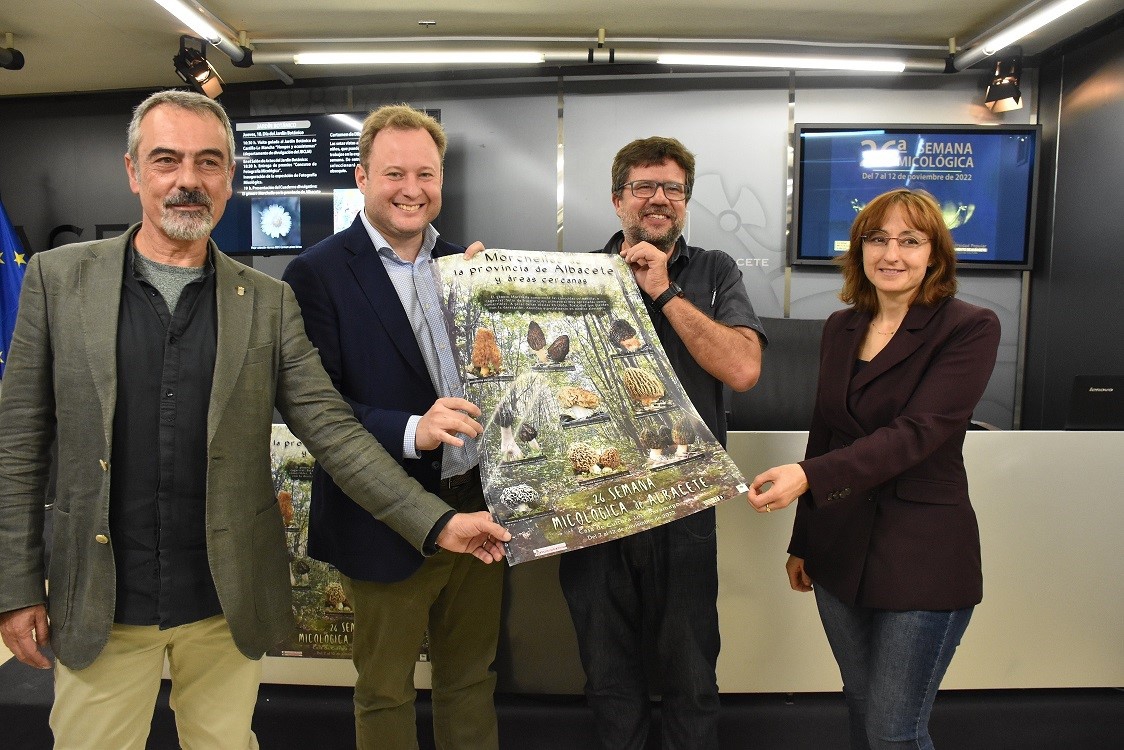 El vicealcalde y concejal de Cultura, Vicente Casañ, ha presentado los actos que se han preparado, junto a José Fajardo, formador del Aula de la Naturaleza y gran impulsor de esta Semana Micológica; Pablo Ferrandis, director del Jardín Botánico de Castilla-La Mancha que acogerá una de las jornadas micológicas, y la directora de la Universidad Popular, María José Jiménez.