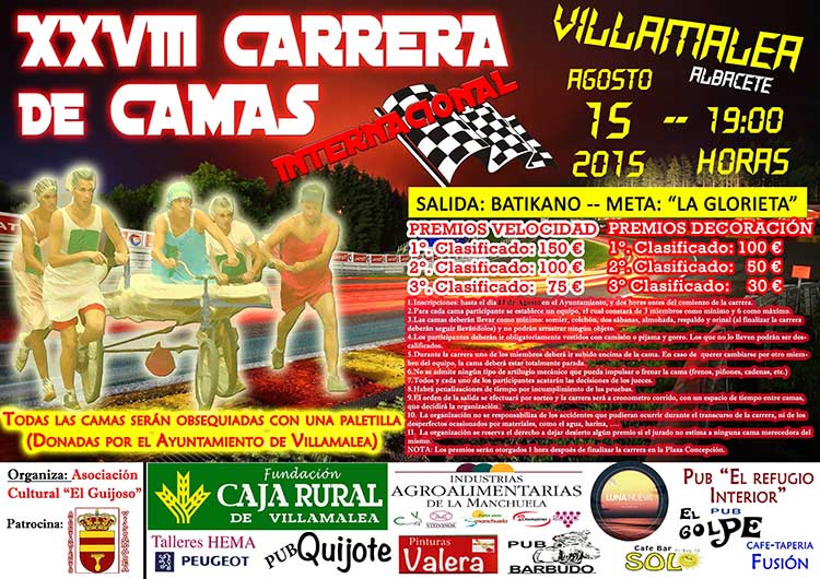 Un año más, la Asociación Cultural El Guijoso de Villamalea, organiza con el Patrocinio del Ayuntamiento de Villamalea, la «más antigua» de las carreras de camas que se celebran por la geografía española y quizás de Europa. Este año se celebra su XXVIII edición. Serán veintiocho años, entreteniendo a toda la gente de la localidad y a cientos de visitantes, de pueblos y provincias cercanas, que se desplazan los días 15 de Agosto, de todos los años, a pasar una tarde muy entretenida. El circuito de la carrera es urbano, por las calles de la localidad, a lo largo del recorrido las camas participantes deberán realizar una serie de pruebas, preparadas por la organización, estas suelen ser divertidas, para que el público asistente lo pase lo mejor posible. Durante todo el recorrido, no faltan las mangueras de agua, con las cuales, aparte de remojar a los participantes, también se refresca, de una forma divertida, al público asistente.