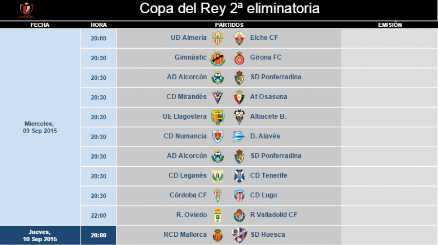 Por último, la segunda eliminatoria de la Copa del Rey concluirá el jueves 10 de septiembrea las 20:00 horas con el partido entre RCD Mallorca y SD Huesca.